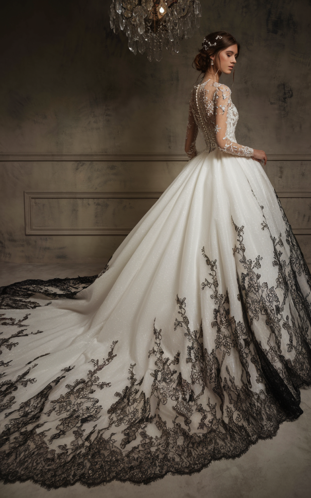 The sculpted bodice, with its sleek sweetheart neckline, embraces the figure in a timeless ivory hue, exuding regal grace. But it’s the voluminous skirt—cascading in an opulent sweep of fabric—that transforms this gown into a true statement. The hemline is kissed by bold black lace, a striking contrast that evokes the mystery of a moonlit garden, where elegance and rebellion entwine.