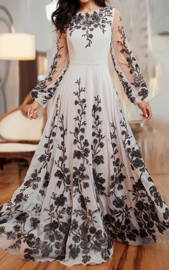The sheer, billowing sleeves add a touch of vintage charm, evoking the elegance of a bygone era while remaining undeniably modern. The embroidered blossoms, rich in texture and depth, seem to climb like ivy along the fabric, creating a mesmerizing illusion of nature reclaiming its beauty. The high neckline keeps the silhouette refined, while the voluminous skirt ensures a dreamlike presence, effortlessly gliding with every step.