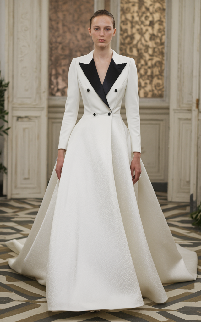 The structured blazer-style bodice, with sharp lapels in contrasting black satin, evokes the precision of a power suit, while the flowing full skirt cascades into an ethereal sweep of luxurious fabric. The crisp double-breasted detailing exudes confidence, ensuring that femininity and power exist in perfect harmony.