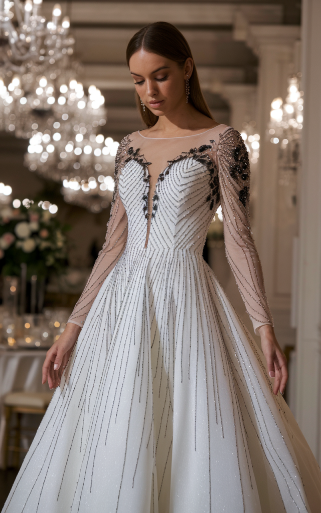 The bodice, sculpted to perfection, features an illusion neckline adorned with intricate black beaded appliqués, tracing delicate tendrils along the shoulders like vines wrapped in moonlight. From the plunging neckline, luminous strands of silver embellishment drip downward, mimicking the mesmerizing descent of shooting stars. The sheer sleeves, kissed with subtle sparkle, add a touch of ethereal delicacy, balancing the structured bodice with an airy, weightless charm.