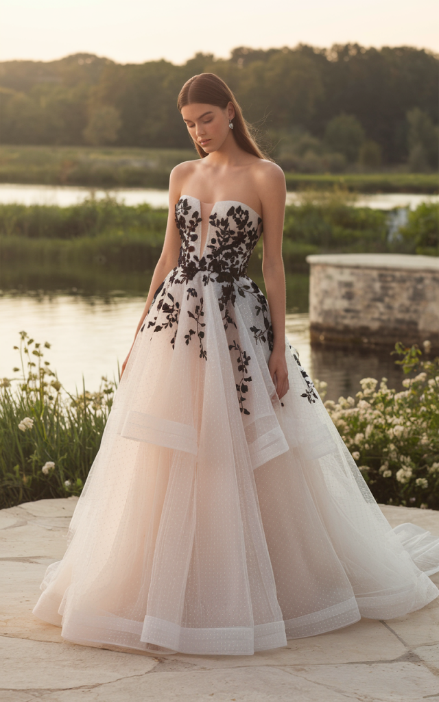 A structured, strapless bodice with a plunging illusion neckline is adorned with intricate black floral embroidery, weaving like climbing vines over a soft ivory backdrop. The juxtaposition of dark botanical details against layers of airy, dotted tulle creates a mesmerizing interplay of light and shadow, evoking a feeling of enchanting mystery.