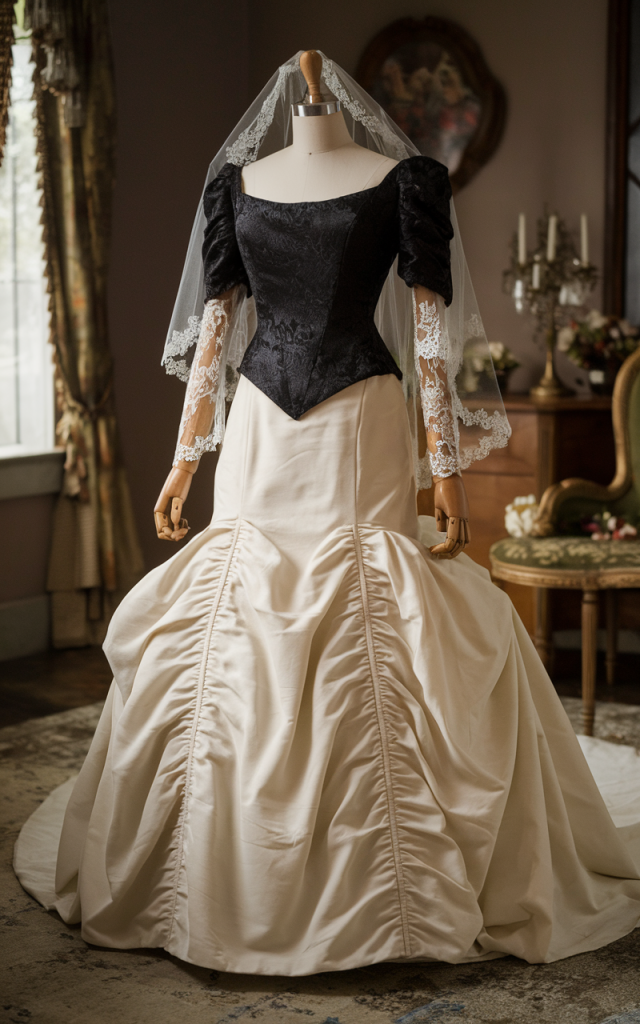 The corseted bodice, sculpted with precision, features an off-the-shoulder neckline and gathered sleeves that add an air of regal sophistication. The contrast between the dark, jacquard-patterned fabric and the soft ruched satin of the skirt evokes a sense of mystery—like candlelit ballrooms filled with hushed secrets and stolen glances. Lace-trimmed sheer sleeves and an intricate veil complete the look, adding an ethereal softness to the structured silhouette.