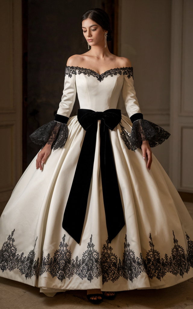The off-the-shoulder neckline is framed by intricate black lace, a delicate whisper of old-world charm against the pristine ivory fabric. Voluminous sleeves cascade into dramatic lace cuffs, adding a touch of theatrical drama, while the bodice cinches at the waist before flowing into a grand, sweeping skirt. The hemline, adorned with ornate black embroidery, mirrors the regal detailing above, creating a seamless harmony of light and shadow. A sumptuous velvet bow drapes from the waist, the final touch of aristocratic refinement.