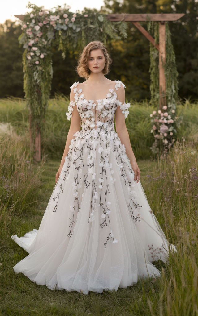 The sheer corset bodice, adorned with hand-sewn floral appliqués, offers a modern, botanical elegance—its cascading petals framing the bride in a halo of natural grace. Wisps of embroidered vines trail down the airy tulle skirt, creating an enchanting illusion of florals in motion, swaying gently like blossoms in a summer breeze. The off-shoulder details add an effortless femininity, soft yet powerful, like a goddess of the earth walking through her own enchanted garden.