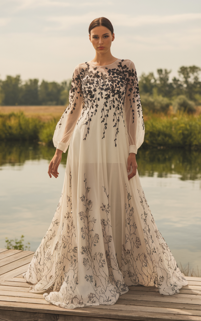 The sheer, billowing sleeves add a touch of dreamlike fluidity, allowing light and air to pass through like whispers of wind. Delicate black embroidery cascades from the shoulders, reminiscent of ivy creeping down an old stone wall, before gracefully fading into the flowing expanse of ivory chiffon. The intricate detailing at the hemline mimics wild botanicals, grounding the gown in an earthy, almost mythical charm.