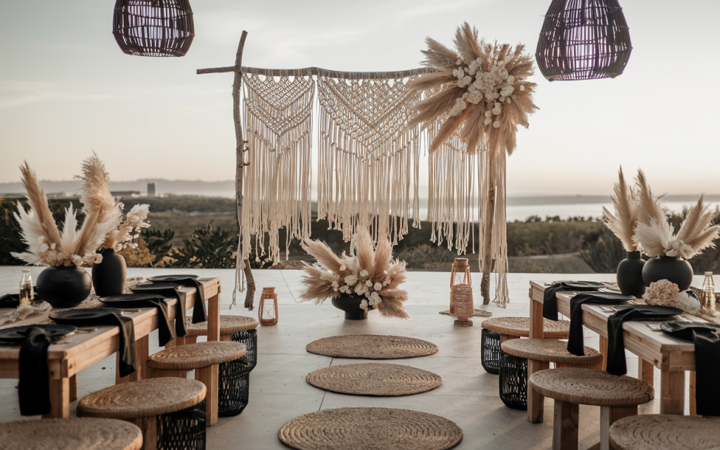 The Boho Dreams: A Black and Neutral Bohemian Wedding is a serene celebration of natural textures and earthy elegance. Set against a stunning sunset backdrop, this design embraces macramé details, pampas grass, and neutral tones accented by bold black elements for a modern bohemian vibe.