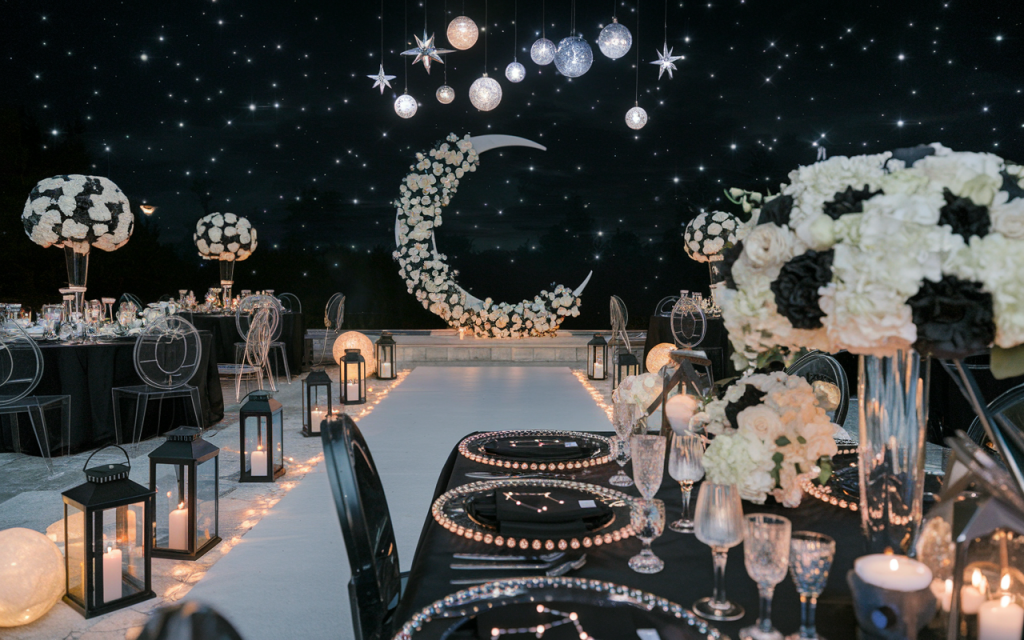 The Celestial Romance: A Starry Night Wedding transforms a wedding celebration into a dreamlike celestial journey. With a dramatic backdrop of twinkling stars, a crescent moon arch, and luminous lanterns, this setup perfectly captures the magic of a night under the stars. The black-and-white color palette, accented by shimmering silver, evokes timeless elegance while maintaining a cosmic, enchanting vibe.
