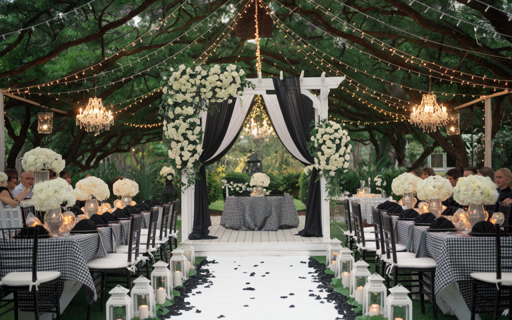 The Enchanted Black-and-White Garden Wedding combines timeless elegance with whimsical charm, set beneath a canopy of twinkling lights and lush greenery. This outdoor celebration uses a classic black-and-white color palette enhanced by lush florals, soft candlelight, and romantic touches for a magical atmosphere.