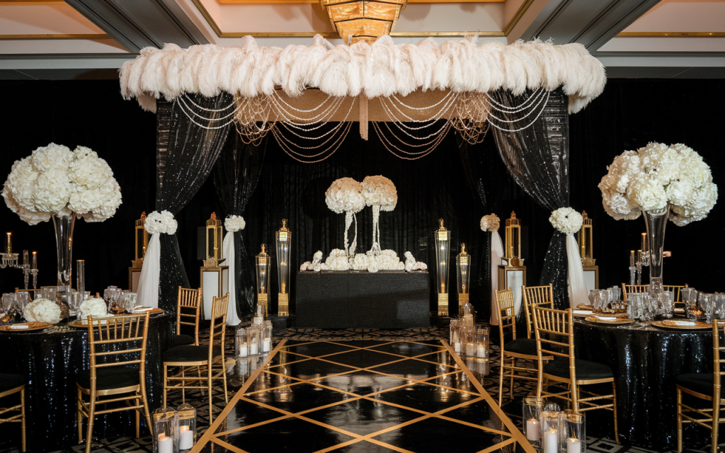 The ceremony space is crowned by a breathtaking feather canopy, adorned with cascading pearl chains and shimmering black drapery. This dramatic centerpiece captures the opulence of the Roaring Twenties, setting the stage for a truly glamorous celebration.