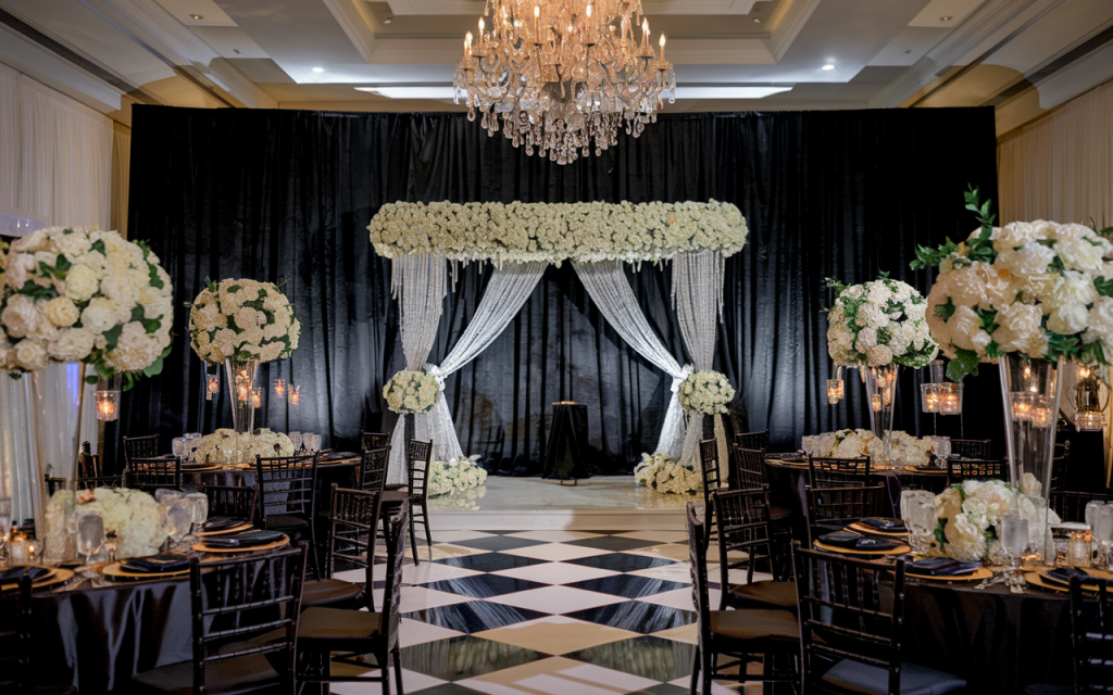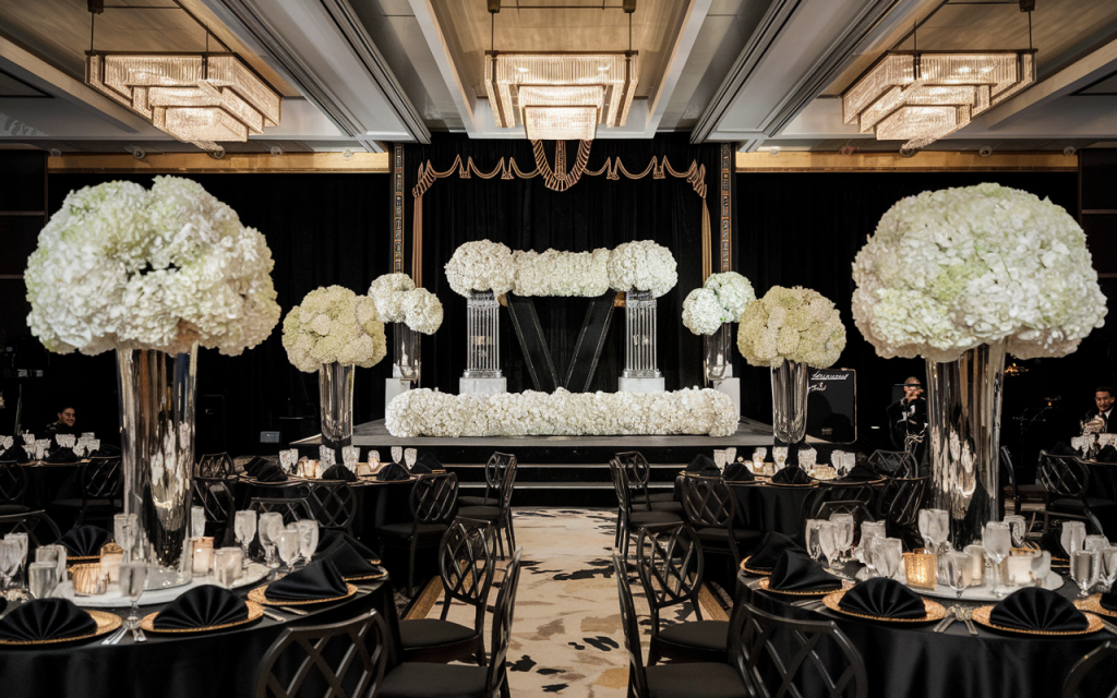 The grandeur of the floral-filled stage, combined with perfectly set tables featuring black linens and golden chargers, creates a celebration that is both regal and glamorous. This wedding is a true homage to the timeless beauty of Old Hollywood.