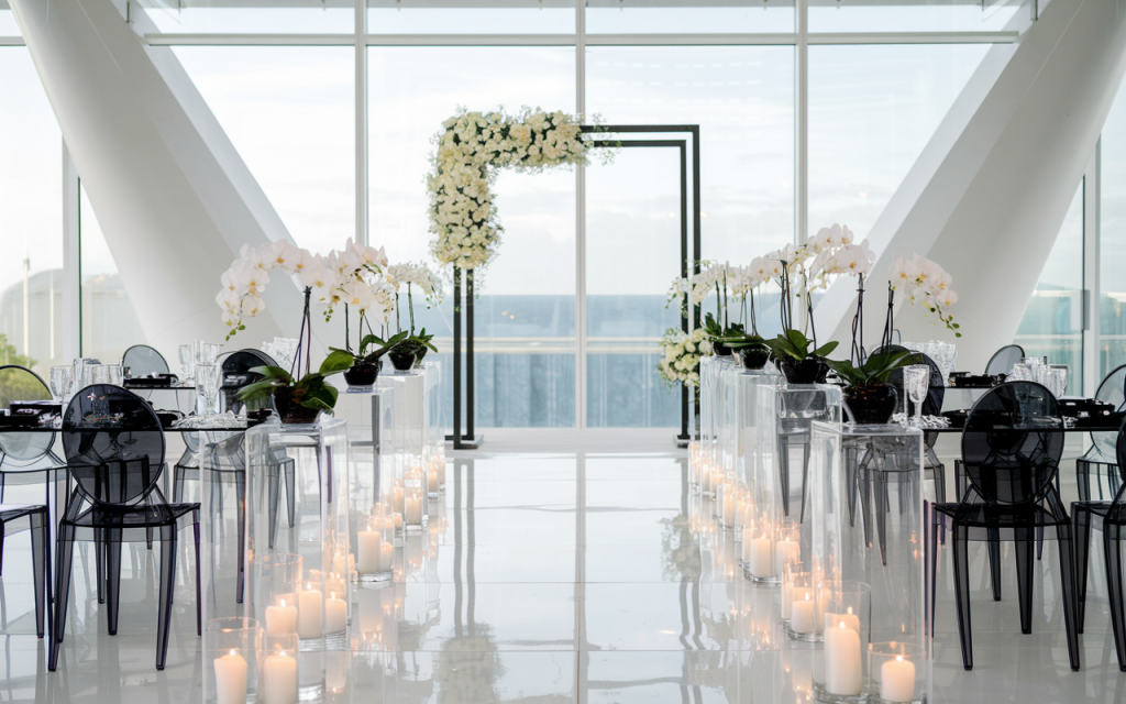 The interplay of natural light, clear acrylic elements, and bold yet understated details creates an ambiance that is both serene and sophisticated. This setting is perfect for couples who desire a wedding that is contemporary, stylish, and effortlessly elegant.