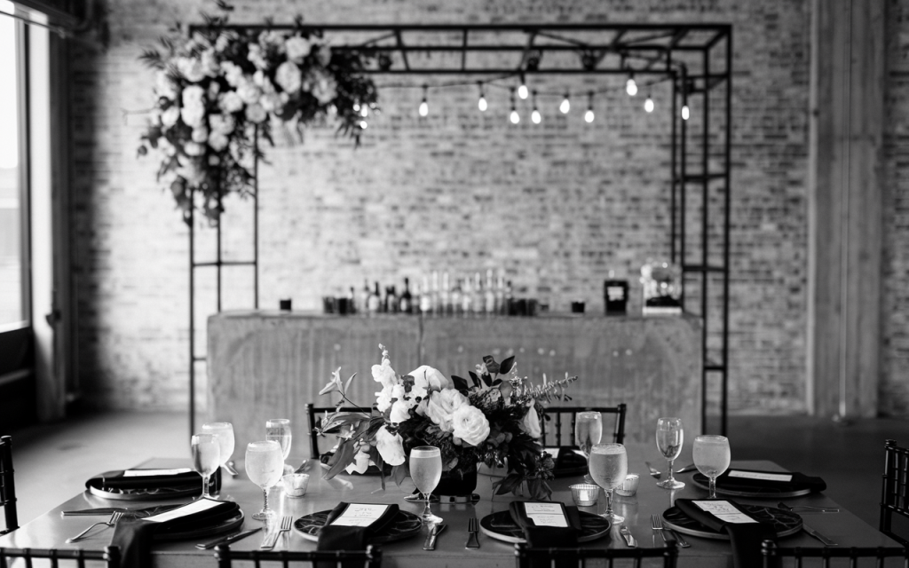 The sharp contrast between light and dark elements is complemented by the industrial backdrop, creating a space that is both dramatic and refined. Each detail, from the floral arrangements to the table settings, embodies contemporary elegance.