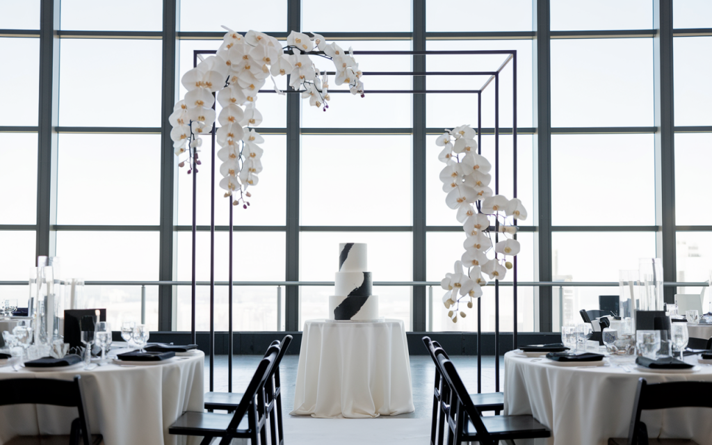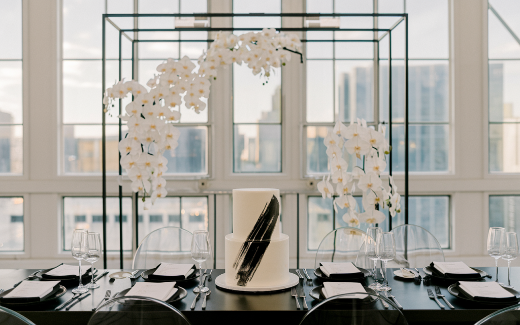 The Sleek Orchid Minimalist Wedding embodies refined simplicity and modern luxury, combining a monochromatic black-and-white palette with delicate orchid blooms and clean, geometric lines. Set against a backdrop of expansive windows and urban views, this design highlights the beauty of minimalism with an elevated, chic aesthetic.