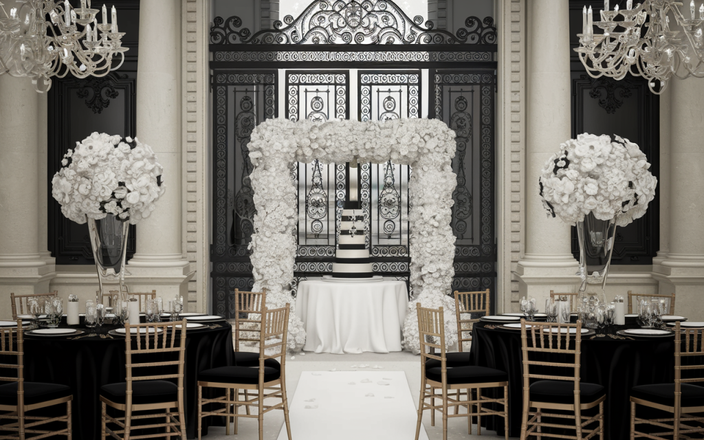 The Opulent Parisian Elegance: A Black and White Wedding transforms timeless monochrome into a regal, French-inspired celebration. Set within a grand, ornate venue, the decor highlights luxurious black and white tones with shimmering gold accents. Sophisticated floral arrangements and intricate details evoke the grandeur of a Parisian château, making this a truly elegant affair.