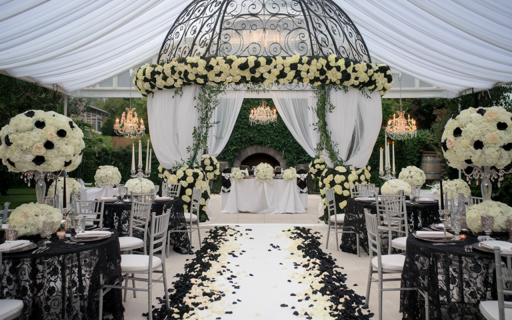 The Romantic Garden Elegance: A Black and White Wedding brings timeless sophistication to a lush outdoor setting. The focal point is a stunning wrought-iron dome adorned with cascading white florals and draped fabric, creating a dreamy and intimate ceremony space. This design combines the beauty of nature with opulent details like crystal chandeliers, black lace table linens, and abundant floral arrangements for a truly luxurious ambiance.