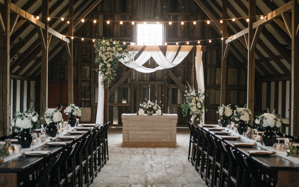 The altar is framed by rustic wooden beams draped with soft white fabric, creating a flowing, romantic effect. Cascading arrangements of white flowers and greenery add a natural touch, while warm string lights overhead enhance the cozy barn ambiance. This minimal yet striking design allows the couple to shine as the focal point.
