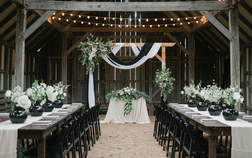 The Rustic Monochrome Barn Wedding embraces simplicity and elegance, combining classic black and white with organic greenery for a sophisticated yet laid-back atmosphere.