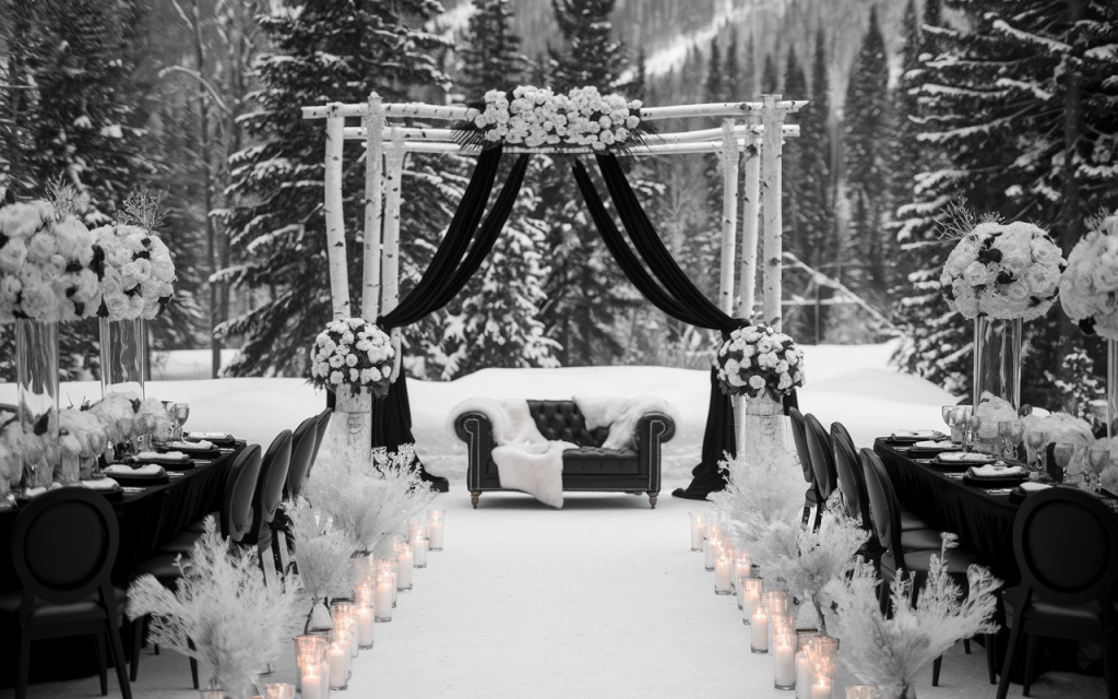 The Winter Elegance: A Snowy Black and White Wedding is a breathtaking celebration of sophistication and nature’s winter beauty. Set amidst a serene snowy landscape, this wedding combines the dramatic contrast of black and white with the softness of snow-draped surroundings. The decor is both luxurious and minimalist, creating a magical winter wonderland with a touch of bold elegance.