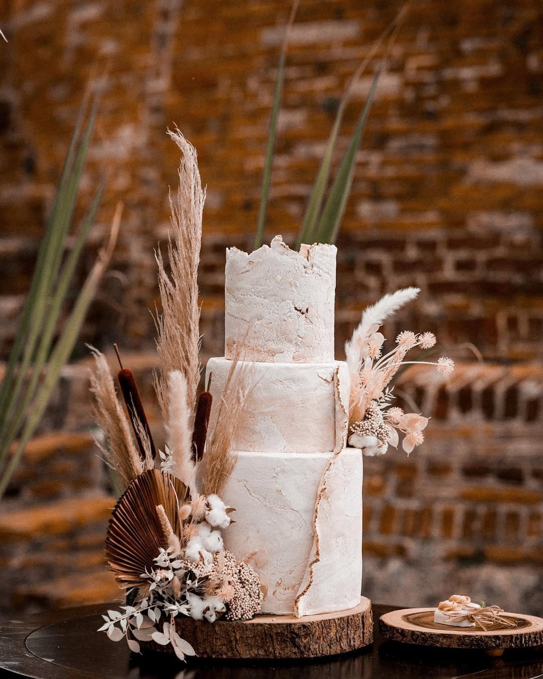 With raw-edged buttercream in soft sandstone hues and a base adorned in pampas, palms, and cotton stems, this cake feels sculpted by nature herself. Each tier carries the texture of weathered stone, balanced by airy blooms and graceful grasses.