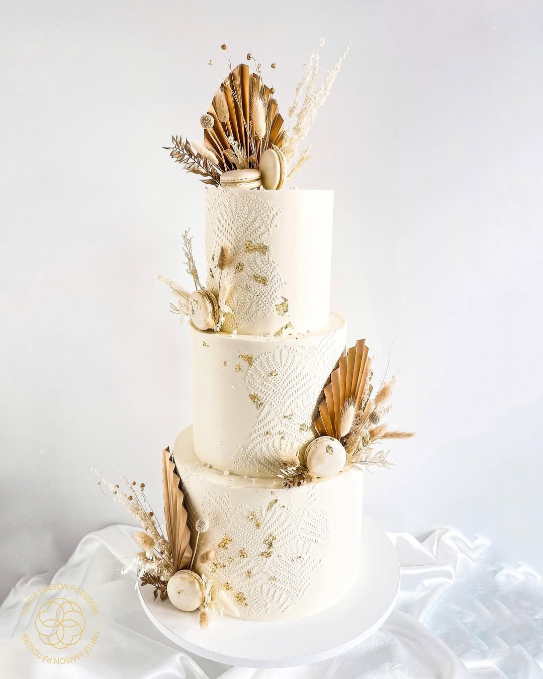 Three pristine ivory tiers, each adorned with delicate lace-like piping and kissed with gold leaf, evoke the elegance of a desert wedding at sunset. Dried palm fronds, sprigs of wheat, and feathery grasses frame the design, while champagne macarons nestle in the arrangements for a touch of indulgence.