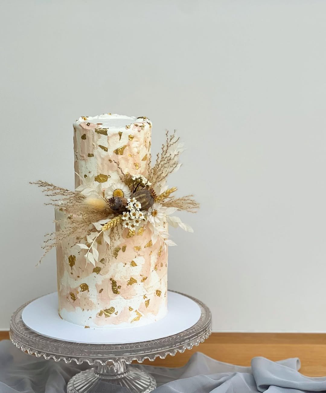 Soft blush and ivory buttercream is flecked with shimmering gold, like sunlight scattered across a wildflower field. At its center, dried blooms, wheat stalks, and delicate seed pods create a natural, textural bouquet that feels both rustic and refined.