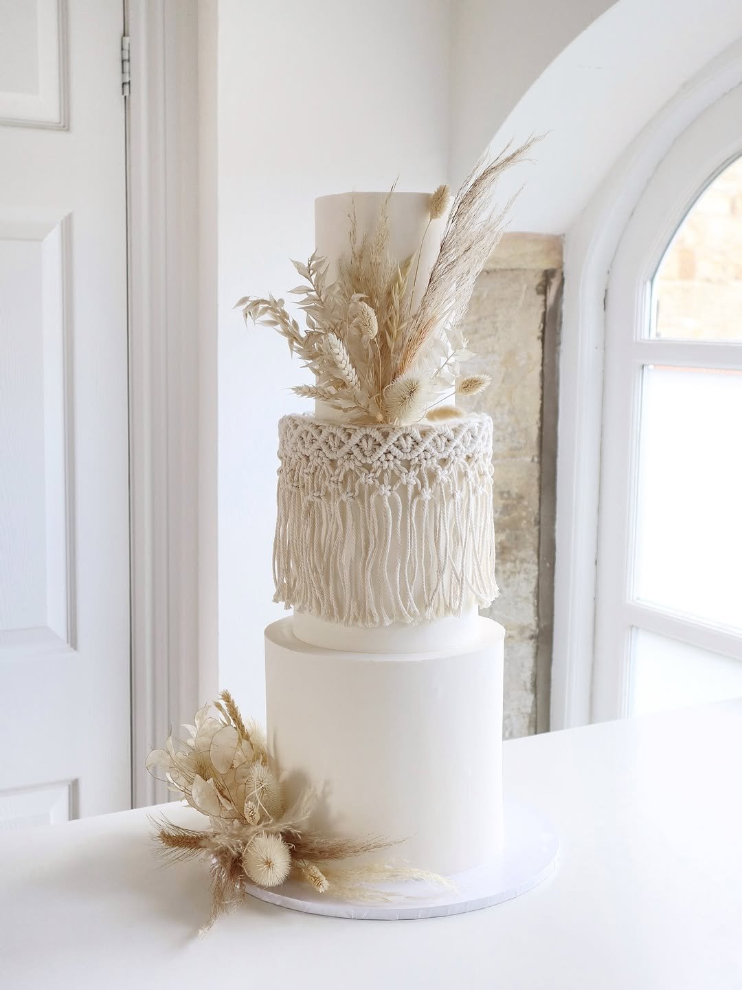 Minimalism meets bohemian soul in this all-white creation, where delicate dried grasses crown the top and a tier draped in edible macramé fringe steals the scene. The palette is pure and serene, yet rich with texture and artistry.
