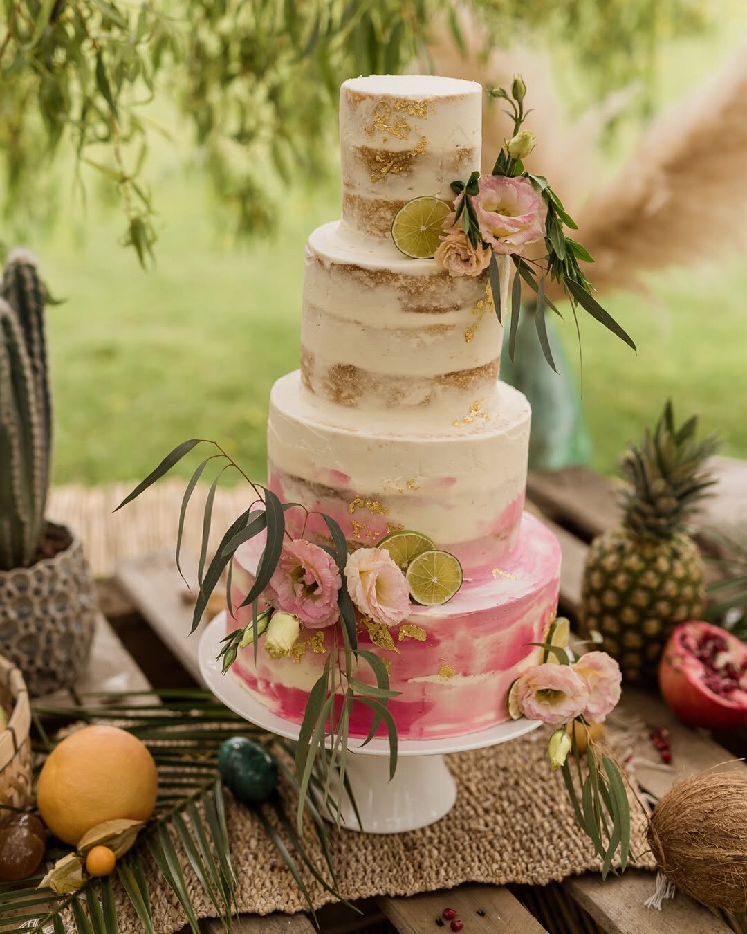 Four playful tiers blend naked cake charm with strokes of pink watercolor and touches of gold leaf, dressed in pink lisianthus, fresh lime slices, and cascading greenery. Surrounded by pineapples, pomegranates, and palms, it radiates island celebration vibes.
