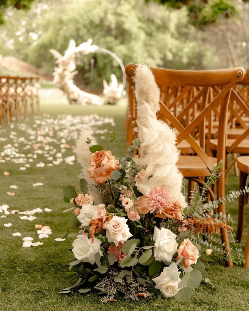 This aisle feels like a soft exhale—dusted rose petals, golden grass, and blush-toned blooms gently spilling onto the lawn. The ceremony arch in the distance mirrors the mood with its crescent of pampas and pastel, glowing beneath the filtered sunlight.