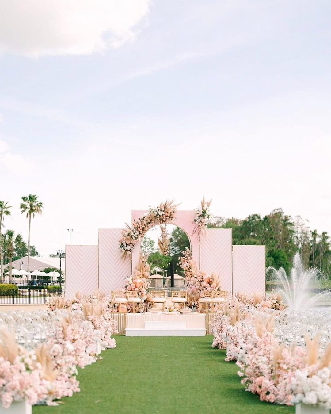 This romantic outdoor setup by @weddingbazaarofficial feels like a bohemian fairytale with a couture twist. Blush tones bloom from every corner — from the floral-lined aisle to the cascading pampas and roses arching overhead in a floral crown of their own.