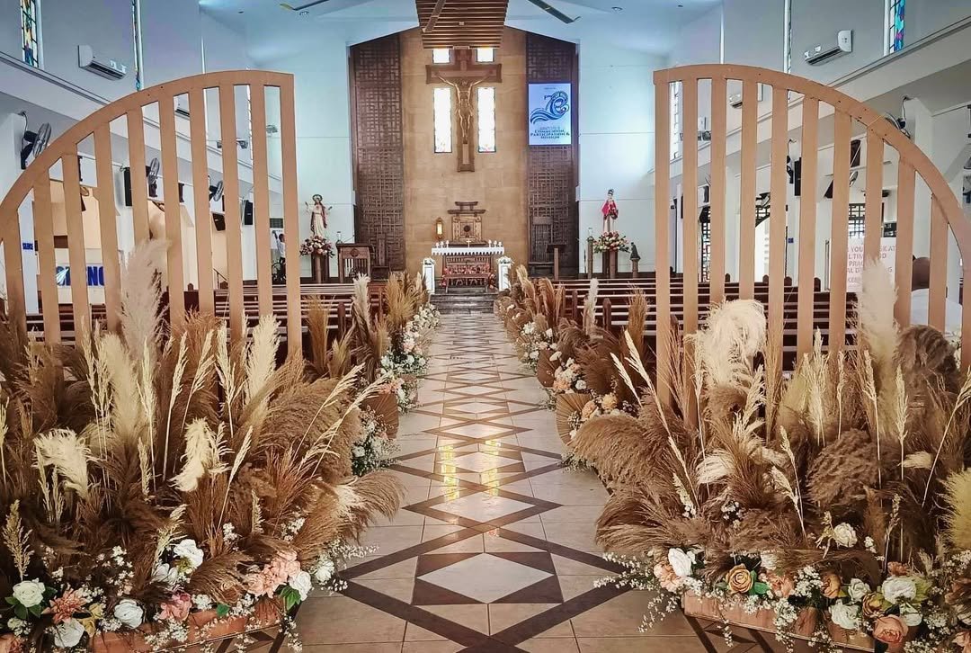 @zarlaantoniodesigns brings the magic of boho style indoors with this breathtaking aisle transformation. Pampas grass, dried palms, and textural neutrals cascade in earthy waves down the cathedral’s aisle, creating a warm, grounded contrast to the soaring sacred space.