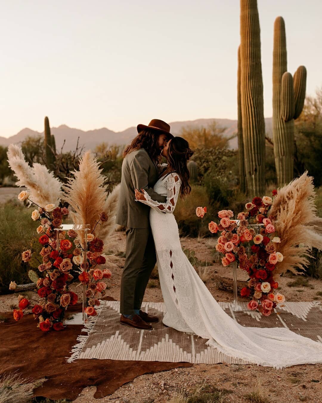 Her lace gown, his felt hat, the desert breeze — it’s boho love at its most free-spirited and timeless.