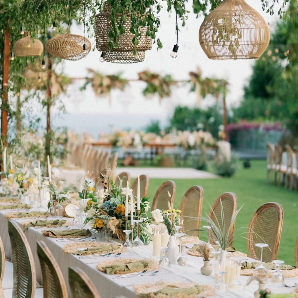 Beneath a canopy of rattan pendants and trailing greenery, this tablescape feels like summer suspended in time. Woven textures, soft neutrals, and pops of marigold play beautifully with the soft linen layers and tapered candles.