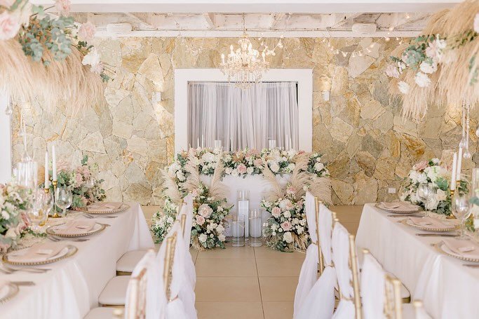 Tucked inside a sun-drenched stone villa, this setup radiates warm, effortless elegance. Layers of blush-toned blooms and pampas grass soften the space with a dreamy texture, while the crystal chandelier adds just the right touch of glamour.