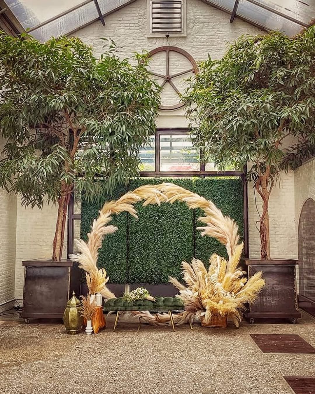 Inside a sun-drenched atrium, @bohemianpicnicsnyc crafts a cozy and elevated moment that feels like a secret garden meets modern boho lounge. The oversized pampas arch — wild, wispy, and richly textured — draws the eye with its soft arc and golden hues, standing boldly against a crisp wall of green hedge.
