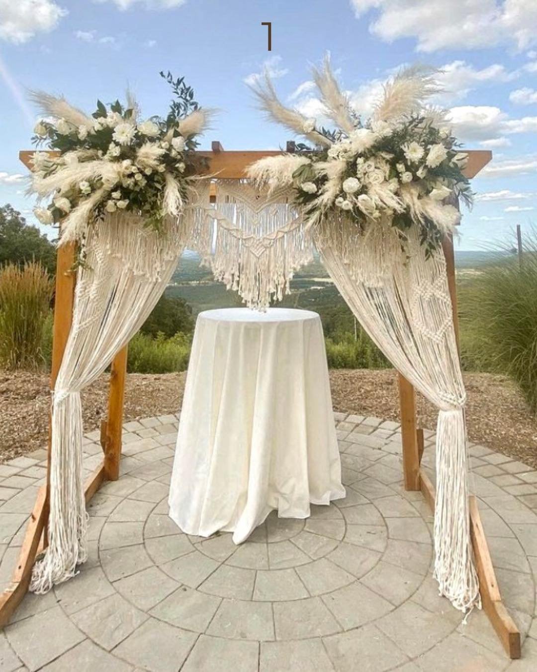 There’s something truly spellbinding about a ceremony perched high above the hills — and @designsbymagnolia captures that magic flawlessly. This altar design is a boho bride’s dream: natural wood structure, soft macramé draping, and a burst of creamy pampas and white blooms that spill effortlessly across the beam.