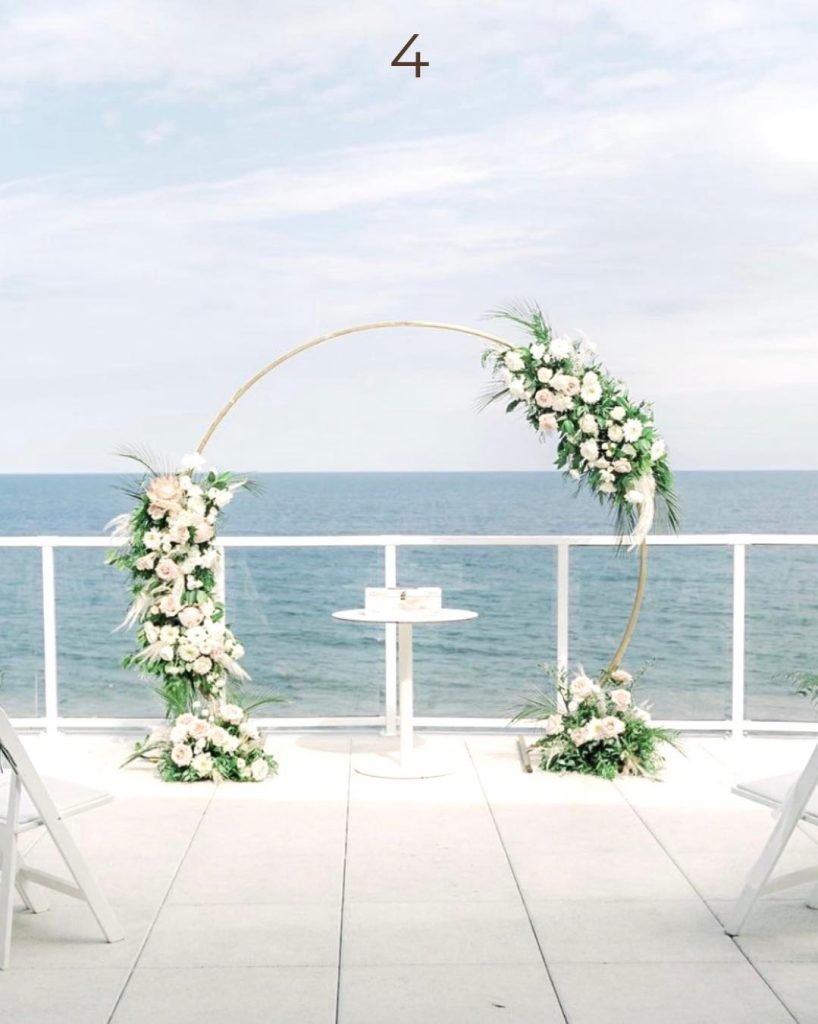 With nothing but the ocean beyond and soft ivory florals curling around a minimalist gold hoop, this ceremony setup feels like pure breath. It’s crisp, clean, and kissed by salt air.