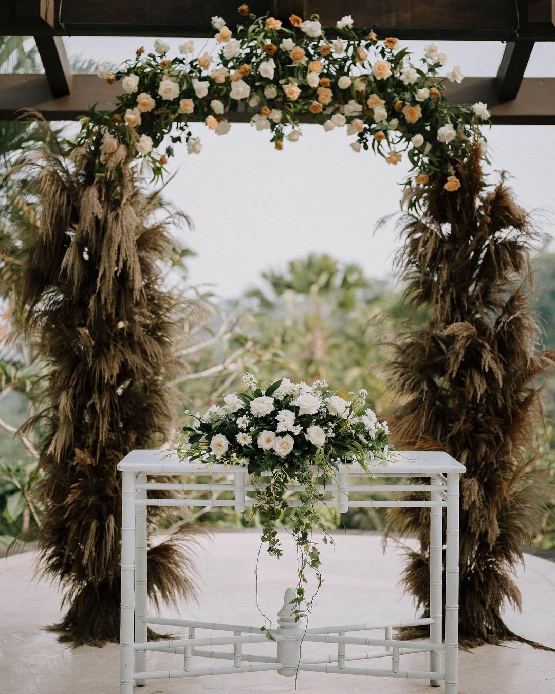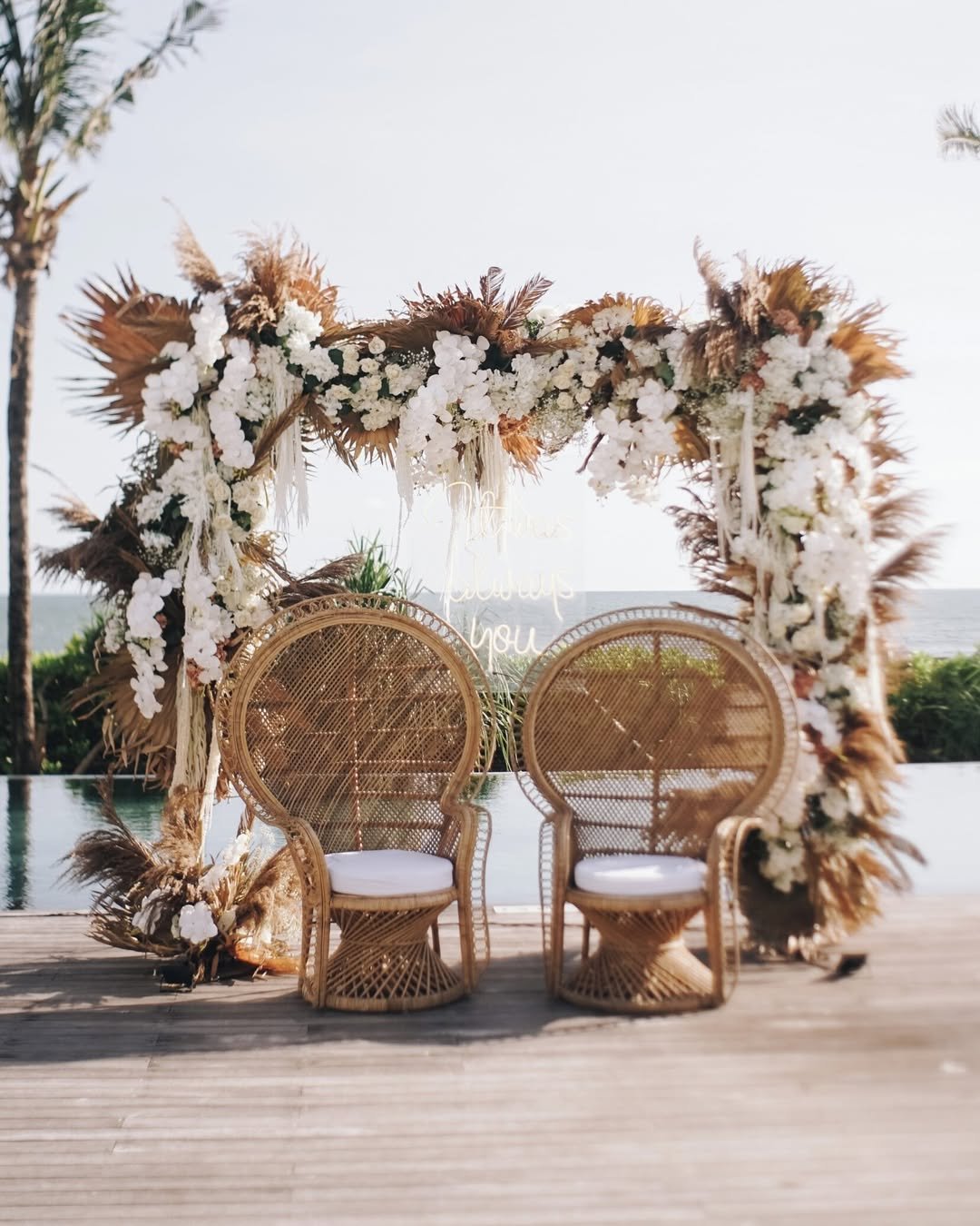 With the ocean glimmering just beyond the aisle, this setup by @balivipweddingstyling is a sun-kissed dream woven in rattan and florals. The focal point? A palm-fringed arch cascading with white orchids, bleached ferns, and soft wisps of pampas grass — nature’s boho confetti catching the light.
