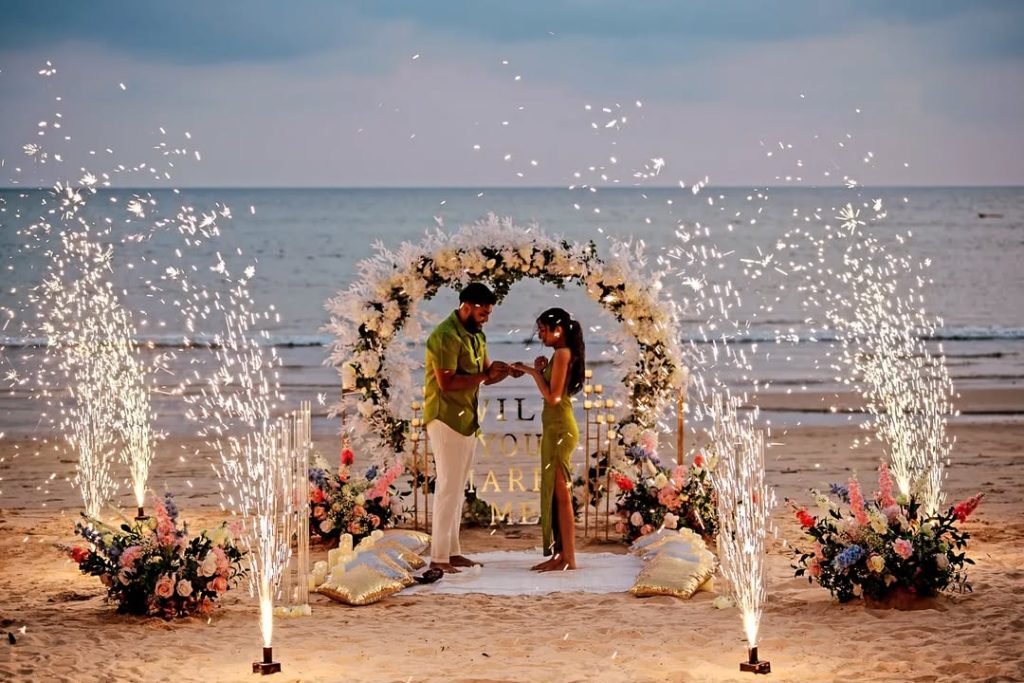 Golden hour met golden promises in this breathtaking beachfront proposal. A circle of soft white blooms, pastel florals, and bursts of sparklers turned the sand into a stage for forever.