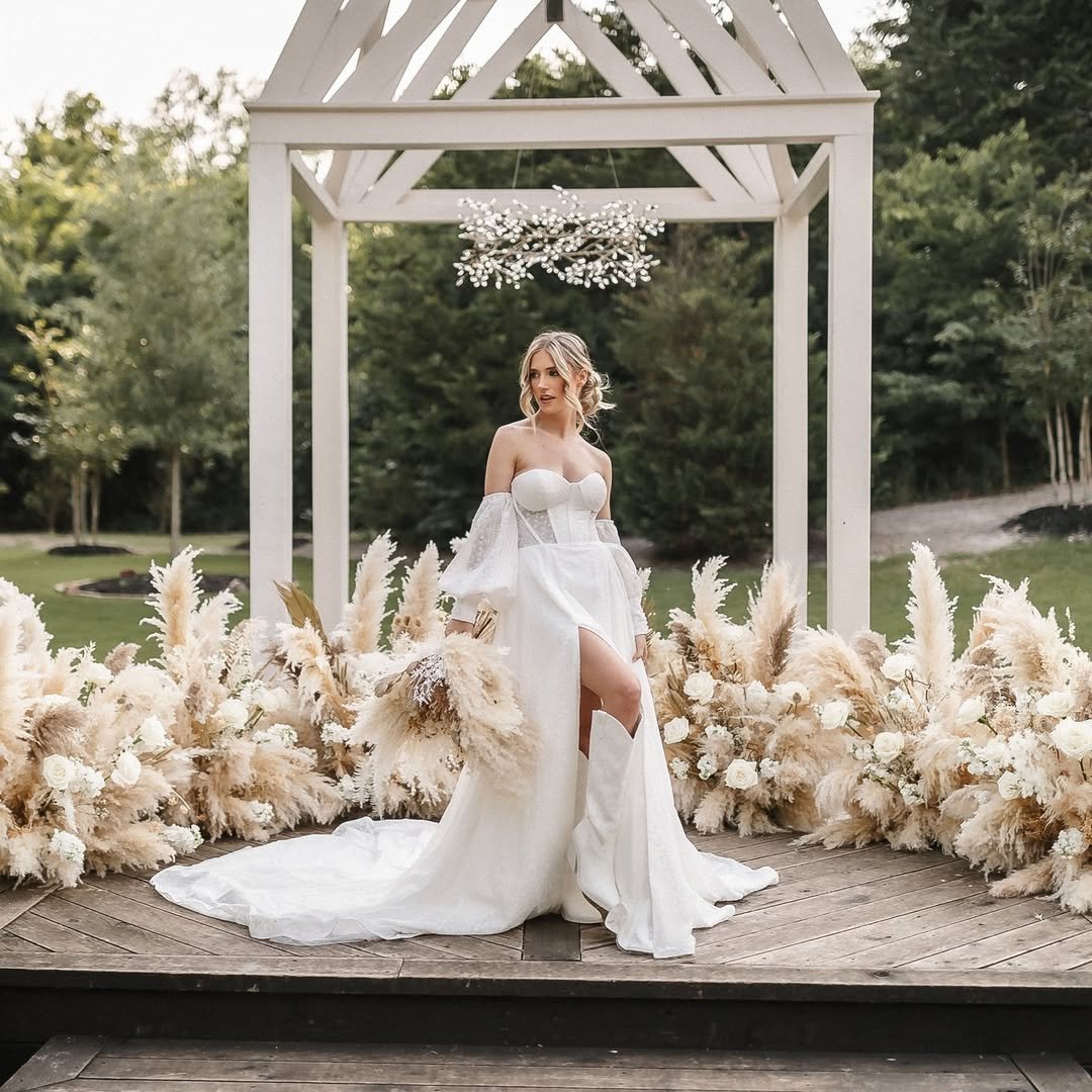 Her off-shoulder gown with delicate sheer sleeves and a sultry slit feels as floaty as the floral scene behind her. With every detail, from her tousled updo to the sculptural pampas clusters, this setup captures the essence of modern boho bridal — refined, radiant, and a little bit wild.