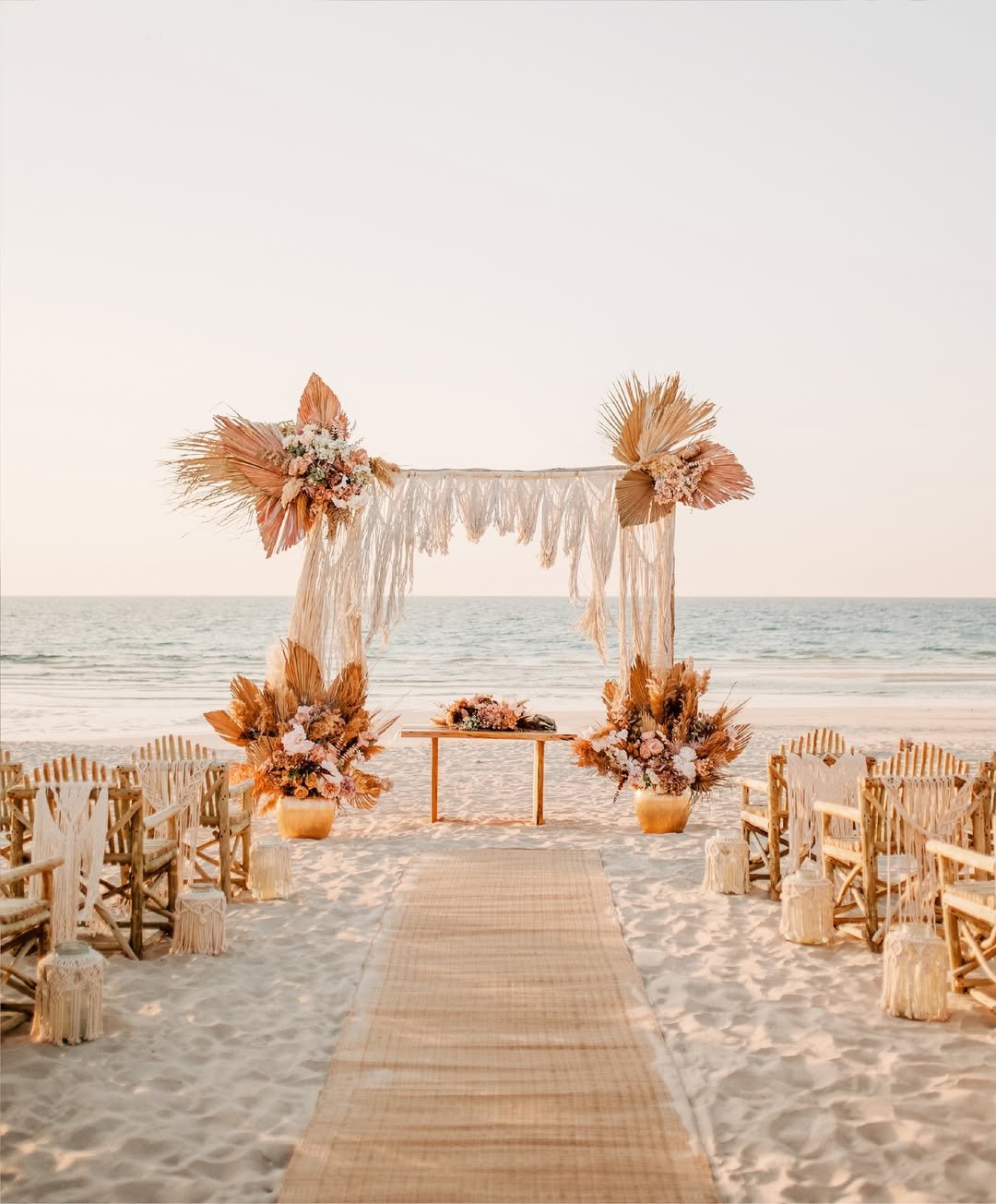 The aisle, flanked with lanterns and raffia-wrapped chairs, leads to a woven macramé arch adorned with wispy pampas, dried palms, and sun-bleached florals in peachy-rose tones. The textures are earthy and undone in the most artful way — perfect for barefoot vows and bohemian hearts.