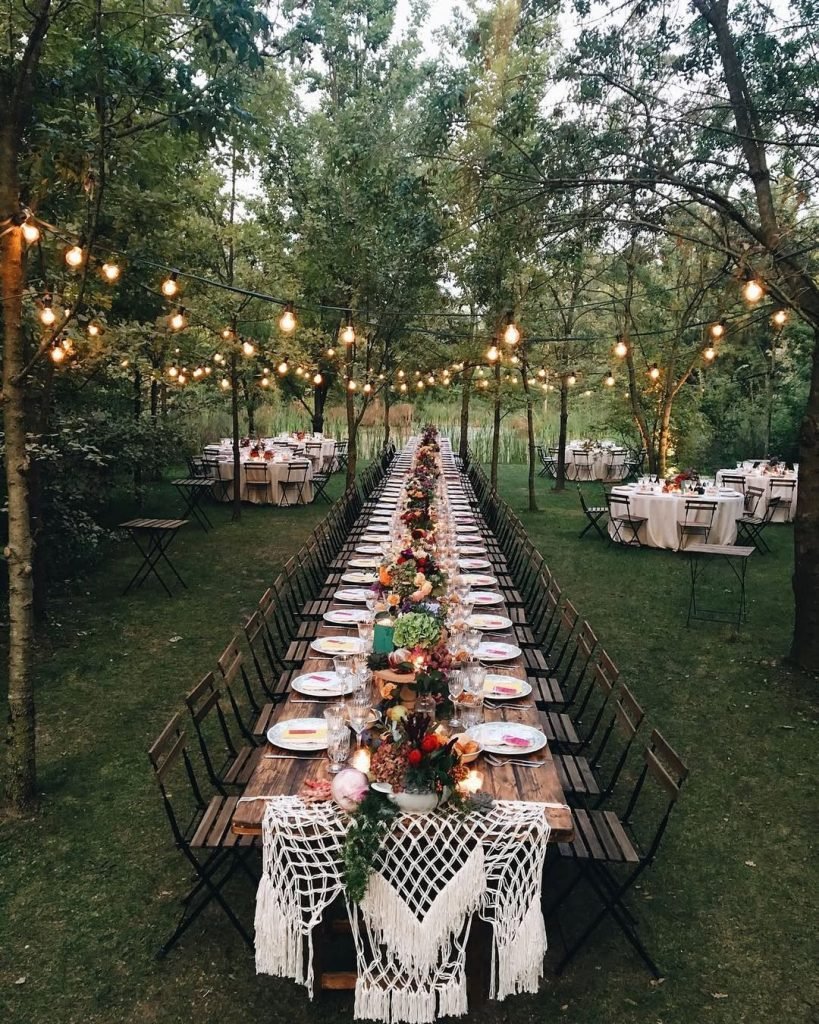 Tucked beneath a canopy of trees and strung with golden bistro lights, this long-table setup feels like a secret garden soirée. Macramé runners, autumnal florals, and rustic wooden chairs create the dreamiest mix of bohemian and romance.