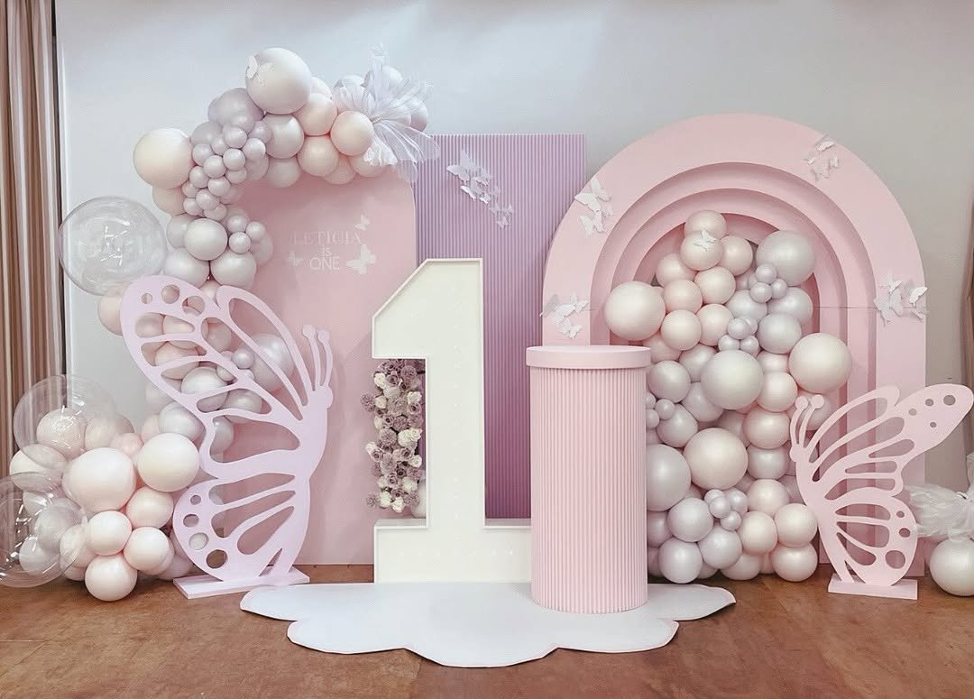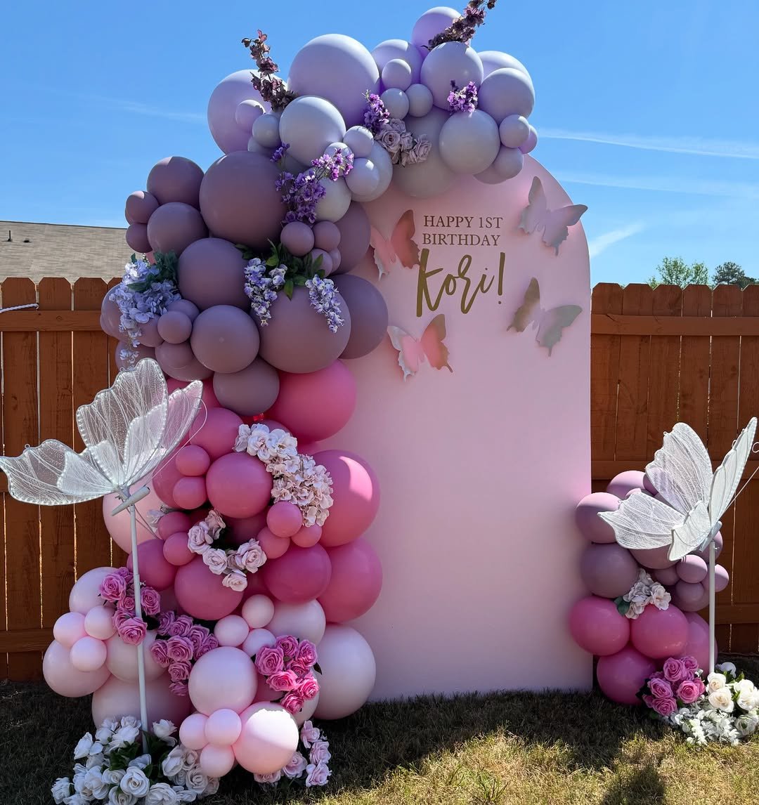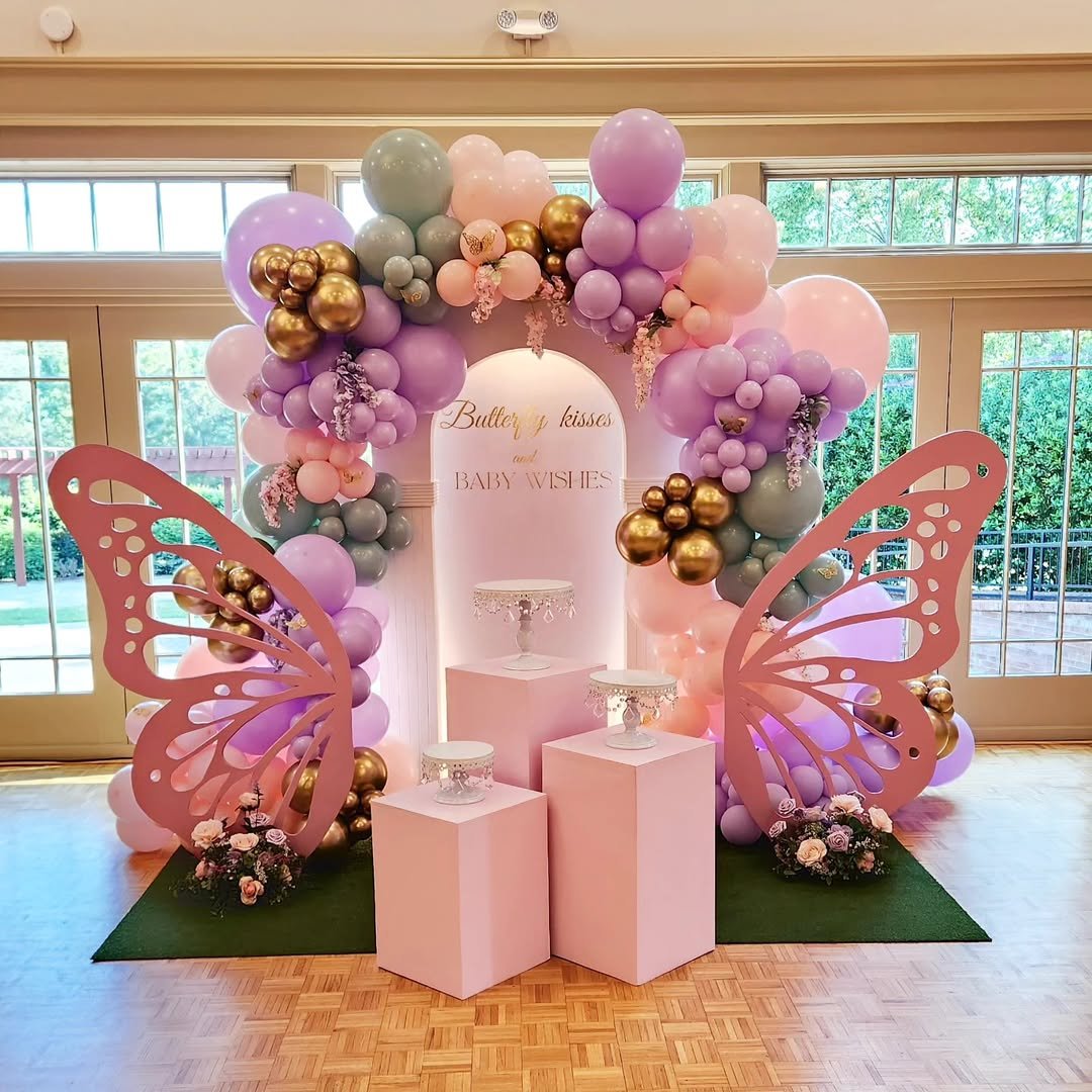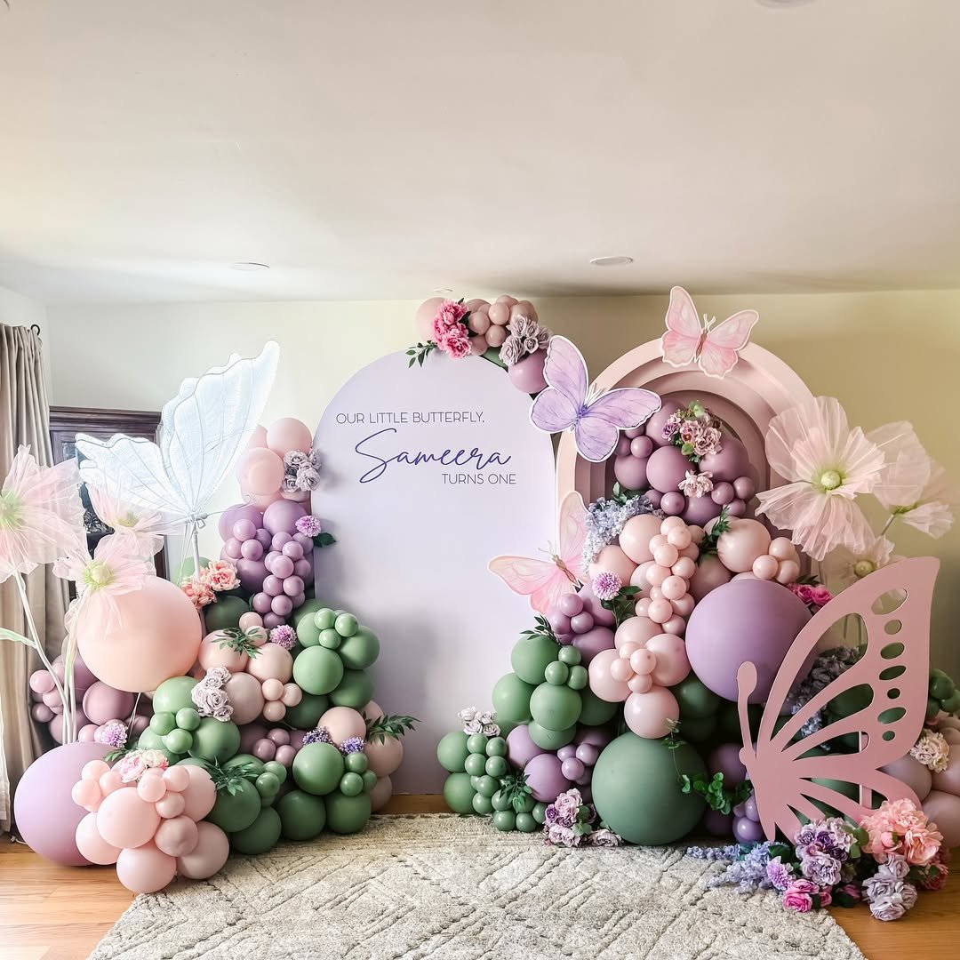 Soft pinks, lilacs, and creamy whites tumble together in the prettiest balloon clusters, almost like a garden in bloom. The oversized butterflies feel light and airy, perched gently across the arch as if they’ve just fluttered in for the celebration. It has that dreamy, fairytale softness that instantly makes the whole space feel magical.