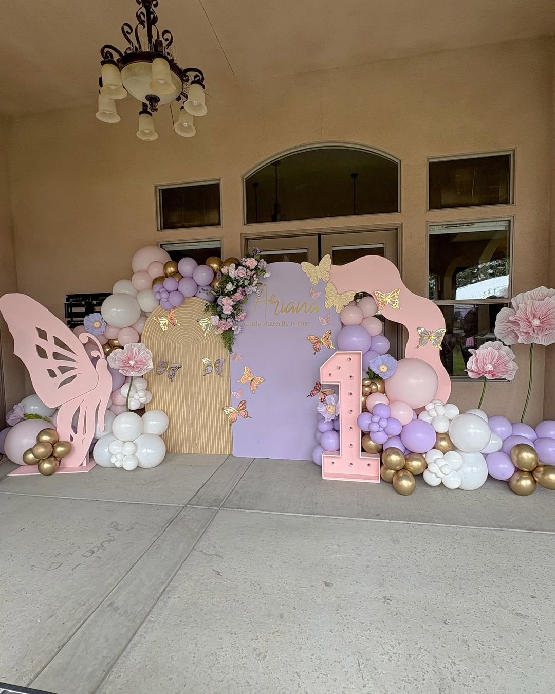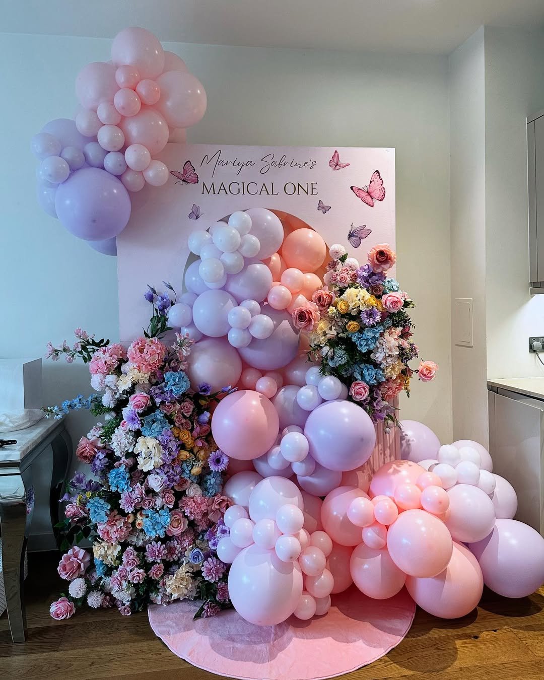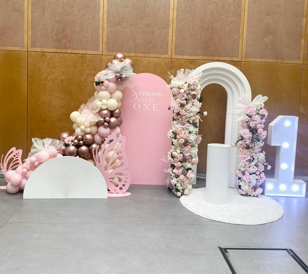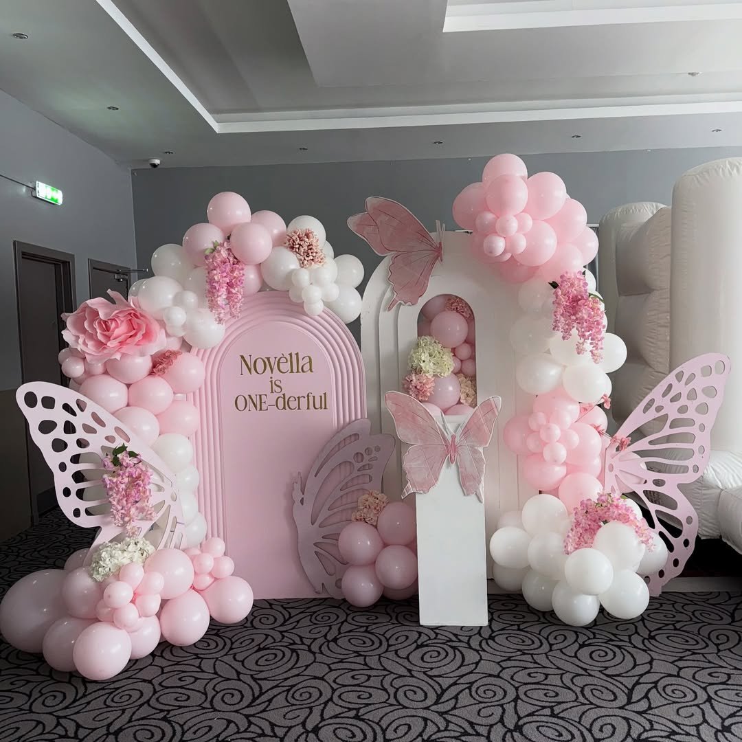 Soft pinks, lilacs, and creamy whites tumble together in the prettiest balloon clusters, almost like a garden in bloom. The oversized butterflies feel light and airy, perched gently across the arch as if they’ve just fluttered in for the celebration. It has that dreamy, fairytale softness that instantly makes the whole space feel magical.