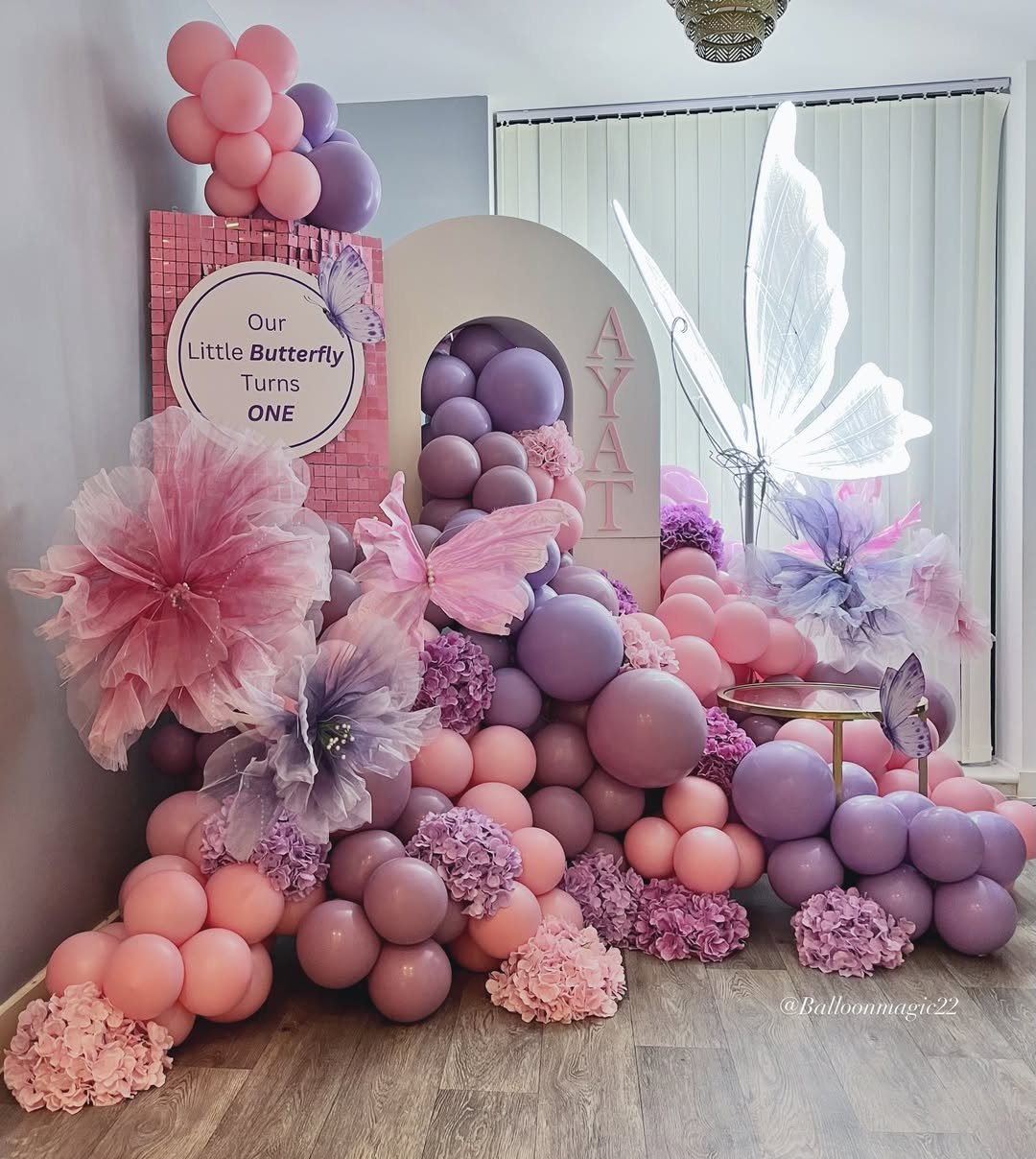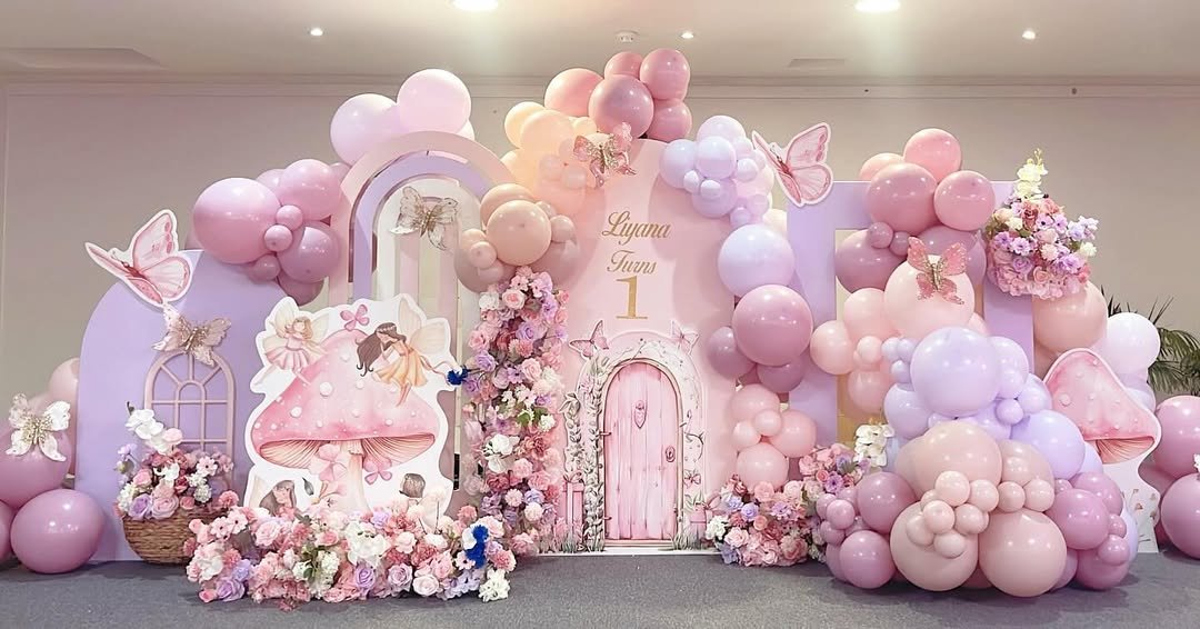 If a fairy tale needed a birthday stage, it might look exactly like this. Layers of pink and lavender balloons stretch across the backdrop, dotted with butterflies, blooms, and playful storybook details that feel straight out of a magical woodland.