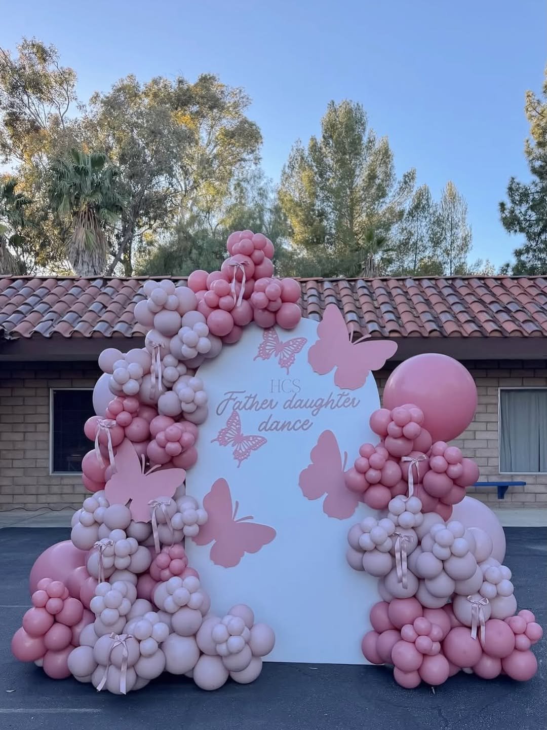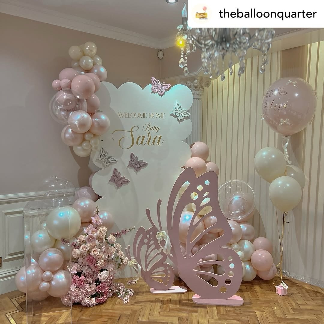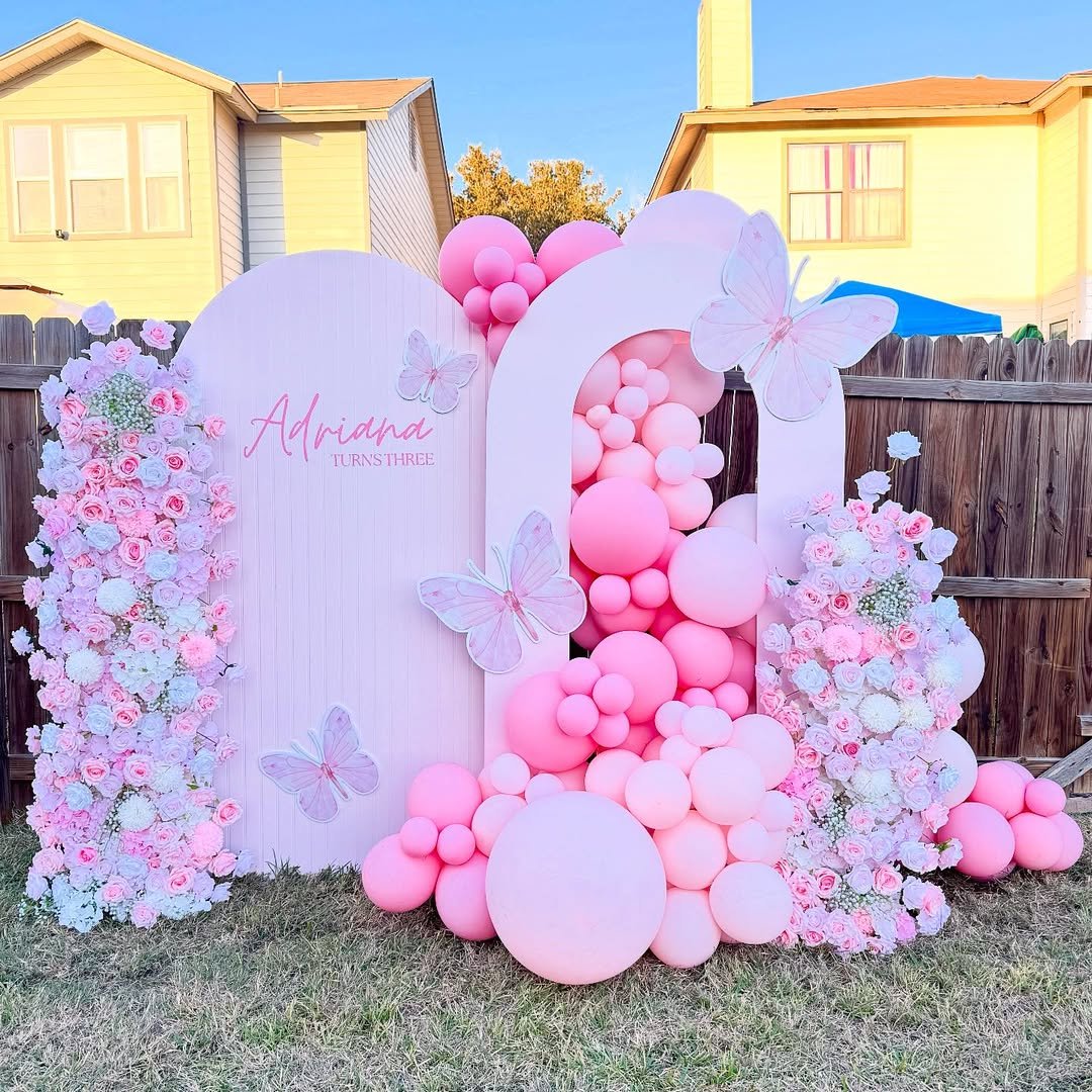 Outdoor parties always have a charm of their own, and this setup captures that perfectly. A soft blush arch paired with cascading balloon clusters and floral walls creates a dreamy butterfly garden moment right in the backyard.
