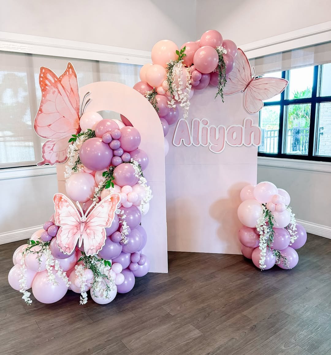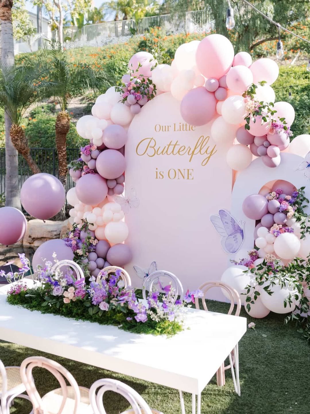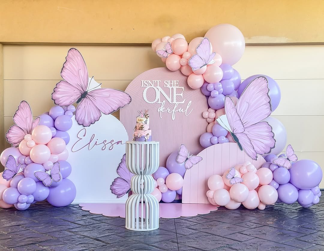 Sometimes simplicity is what makes a design feel so polished. Here, a soft pink palette paired with white balloons and floral accents creates a clean butterfly garden moment that feels both sweet and elegant.