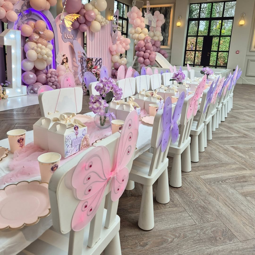This setup feels like stepping straight into a pastel butterfly garden. Rows of tiny chairs dressed with delicate butterfly wings line the table, while soft pink tulle runners, floral centerpieces, and pastel party boxes create a scene that feels both playful and polished.