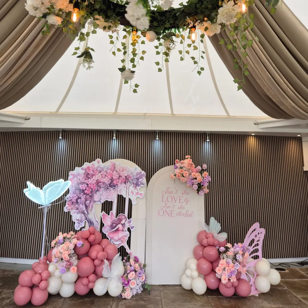 And that glowing butterfly wing? Pure magic. It turns the whole corner into a little spotlight moment, perfect for cake cutting or photos with family. A design like this proves you don’t need a massive space to create a scene that feels playful and enchanted.