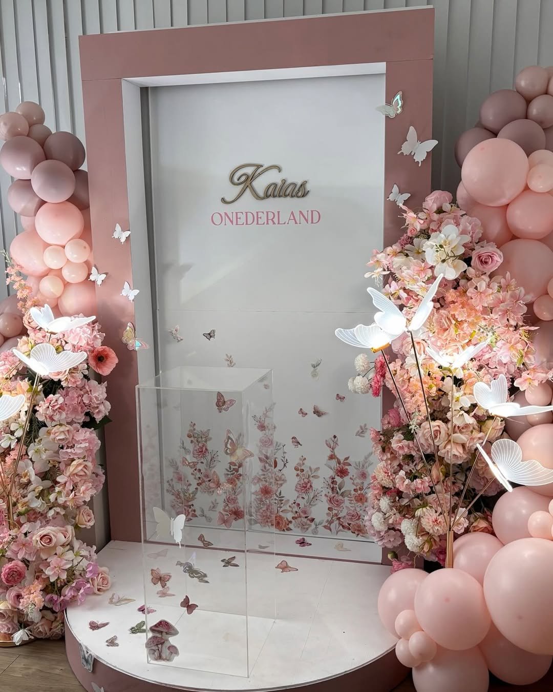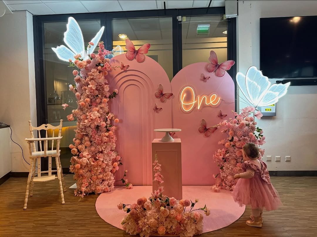 This one leans into a more magical, evening vibe. The glowing butterfly lights and warm neon sign bring a soft glow to the pink floral backdrop, making the entire setup feel like a dreamy little garden after sunset.