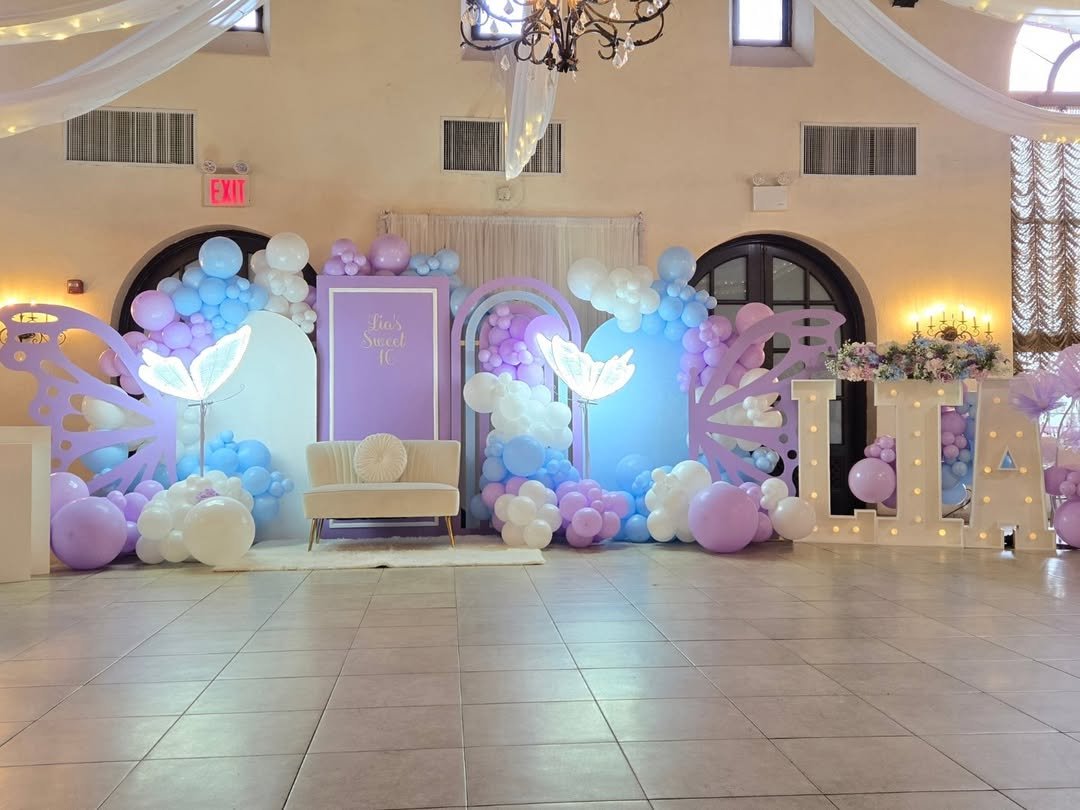 This one feels like walking into a pastel dream. Soft clouds of blue, lavender, and blush balloons fill the space, while glowing butterfly lights and oversized marquee letters add that wow-factor moment.